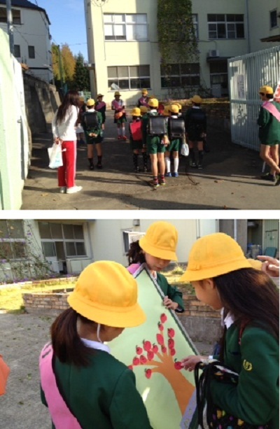 しっかり班全員で大きな声を出してあいさつできた班にはりんごの実をわたし、あいさつの木にはりつけてもらいました。