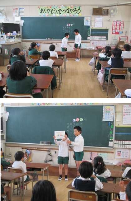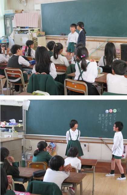 4年生が自分たちで作った「書評まんざい」をとなりの学級に発表しに行きました。その後、代表の3チームが3年生の学級へ「書評まんざい」の出前に行きました。