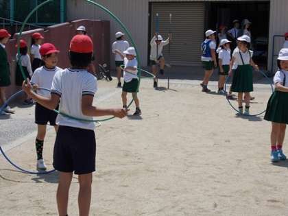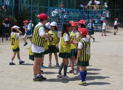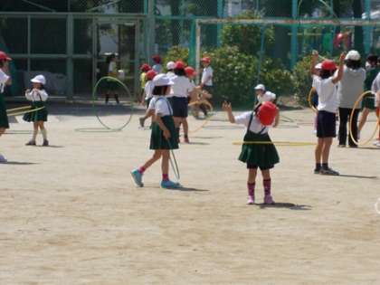 ゼッケンをつけているのは、自由遊び(おにごっこ等)のグループです。同じ色が一緒のたてわり班です。
