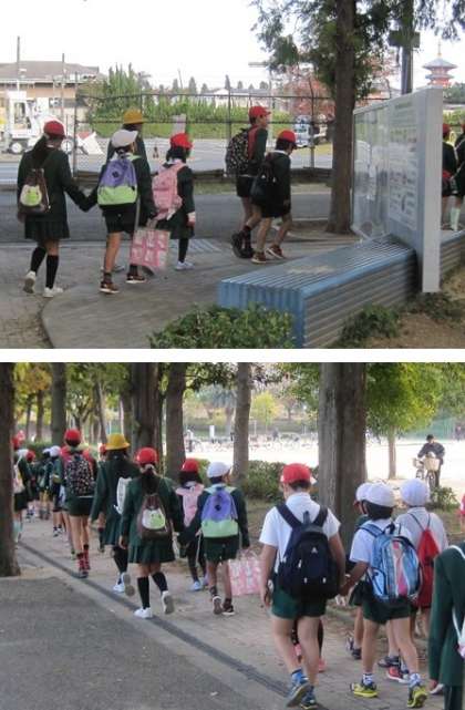 運動場にたてわり班で集まって開会式をした後、2分間隔で鶴見緑地に向かって出発していきました。