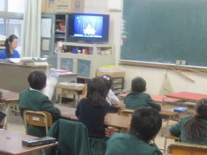 今日は日曜日に雨が降ったので運動場の状態が悪くテレビ朝会となりました。