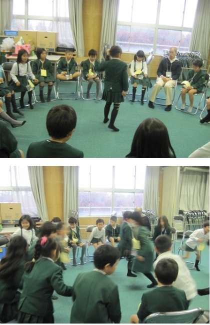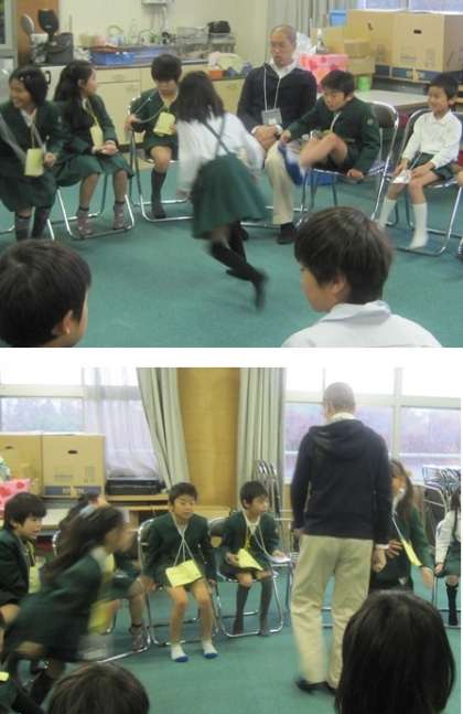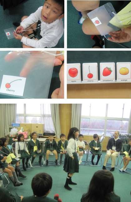最初に果物の名前の言い方を練習して、その後習ったことを使ってフルーツバスケットをしました。