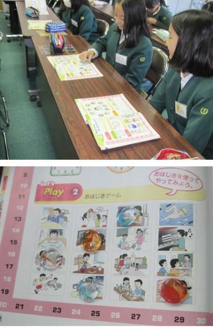 絵の上のすきなところにおはじき5つ置いて、エディーが言った絵の上だったら、おはじきを取ります。5つのおはじきを全部取ったら「ウィナー」となります。