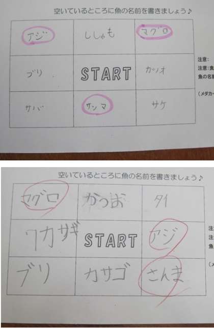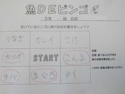 魚の名前を使ってのビンゴゲームでは、日ごろ魚に親しんでいる児童とそうでない児童では、知っている魚の名前の数に少し差があるように思いました。