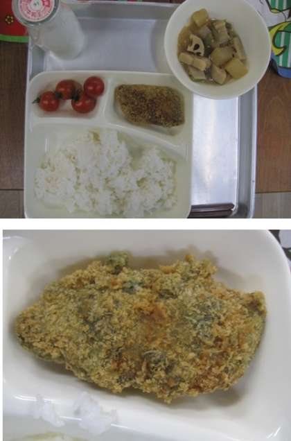 青のりは、太陽にあてて乾かした後、粉にしたり、板状にしたりしたものをよく料理に使います。今日の「まぐろのいそ風味フライ」では、まぐろに下味をつけた後、小麦粉と青のりを水であわせたものを衣としてつけ、その後にパン粉をまぶして油であげています。一口食べると、青のりの香りが口の中に広がっておいしかったです。