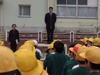 児童朝会が行われました。校長先生のお話は、「インフルエンザに気をつけよう。」「係、役割は責任もって行おう。」「2学期のまとめ、復習をしよう。」の3点が話されました。