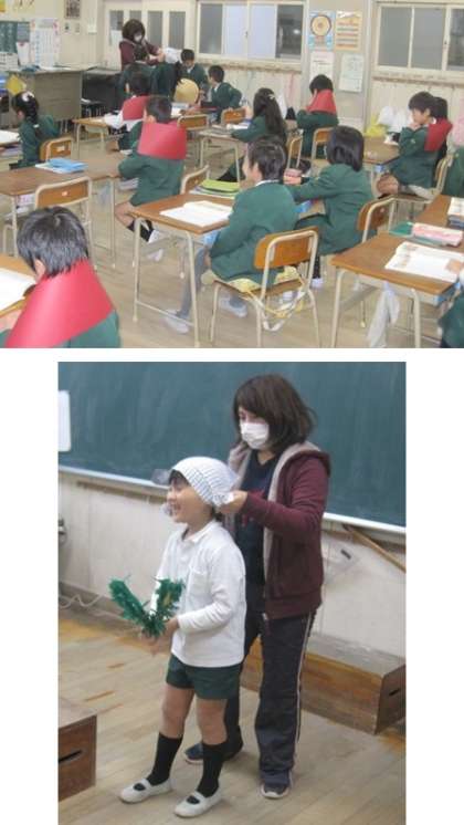 おかざりの「まつ」を売る役の児童は頭に手ぬぐいがわりの豆しぼりをまいてもらってました。みんなにこにこ、とっても楽しそうにかさこ地蔵の練習をしていました。