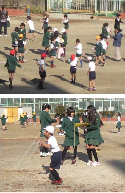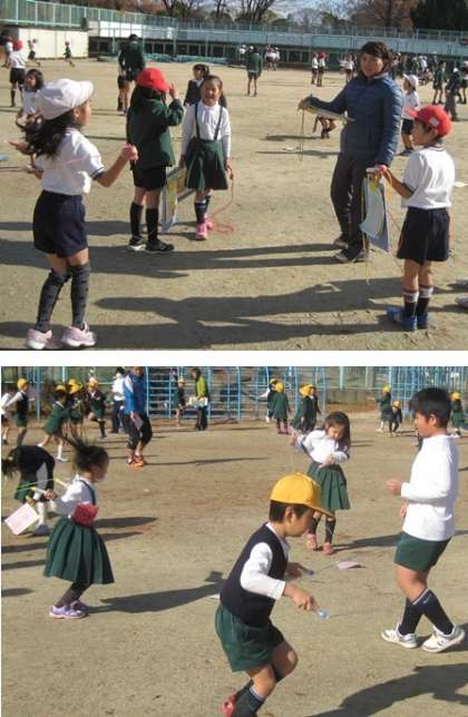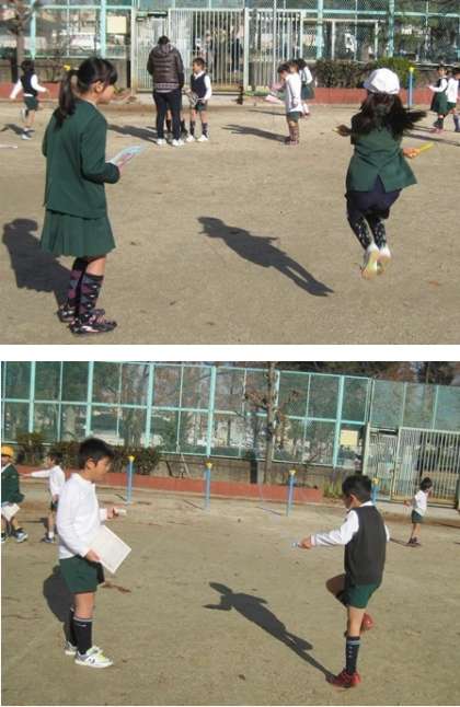 気温が低いうえに、強風で大変でしたが、1、2年生のなわとび検定が行われました。