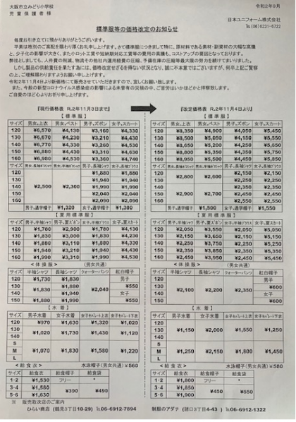 11月4日より標準服の価格改定がありますのでお知らせします。