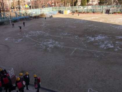 これは「雪」や「霜」ではなく昨日教職員で運動場にまいた「にがり」です。