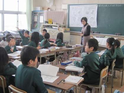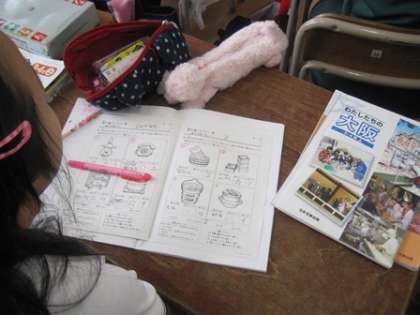 普段の生活では見かけなくなった道具について、教科書や資料を使って学習します。これらの道具を、2学期に社会見学で訪れた「暮らしの今昔館」でしか見たことのない児童もいるようです。