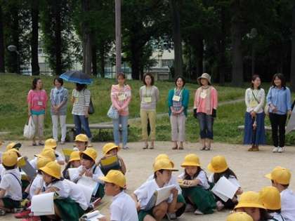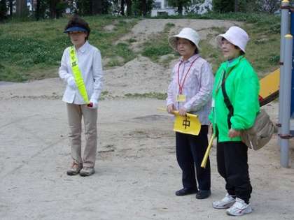 最初に、児童公園で集合して、お世話になるボランティアのお母さんたちや地域の方にあいさつをしました。