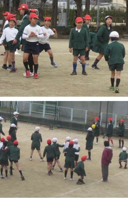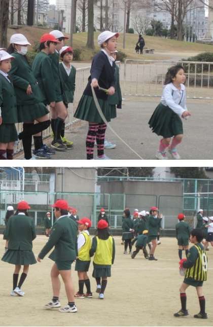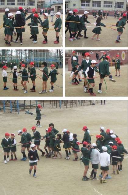 今回のあそびでは「フープ」を使ってみんながつながる遊びを考え出した児童がいて時間の最後には、長い列ができていました。