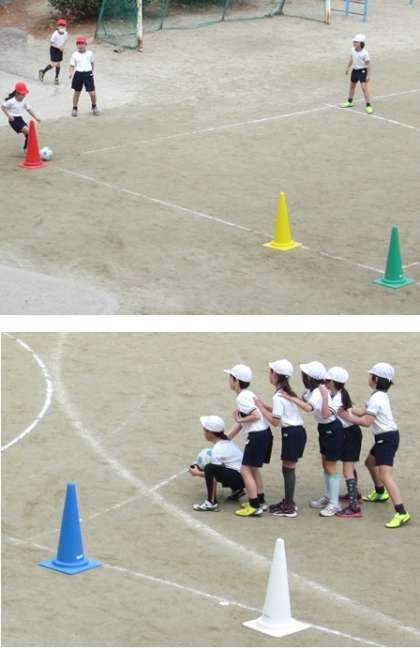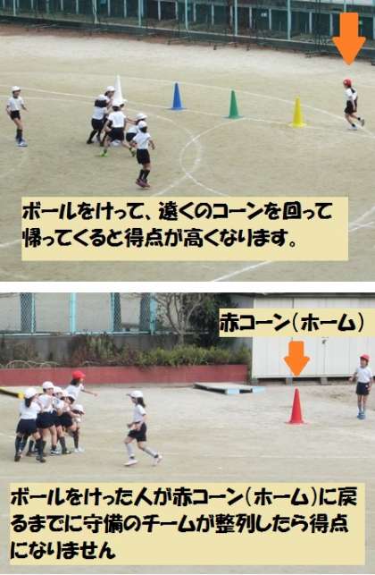 攻撃側は、遠くのコーンを選択すると高得点になりますが、失敗する確率があがります。また、守備側は全員が協力しないとボールを蹴った人をアウトにすることができません。