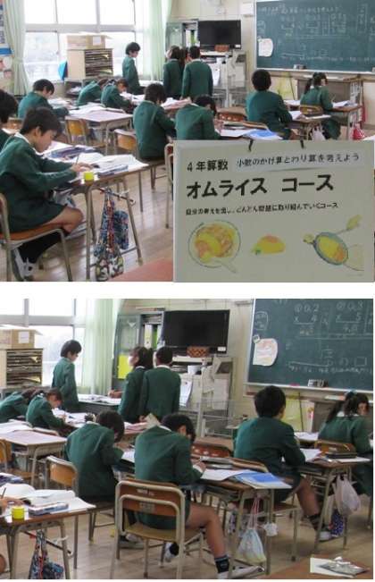 先週までは国語「同じ読み方に気をつけよう」という単元で少人数学習をしていましたが、今週は算数「小数のかけ算とわり算を考えよう」で習熟度別学習をしています。