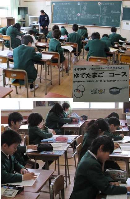 児童は3つのコースに分かれて自分のペースで学習しています。算数は全部で16時間程度かけて学習をします。今日はその3時間目です。みんな一生懸命問題を解いていました。