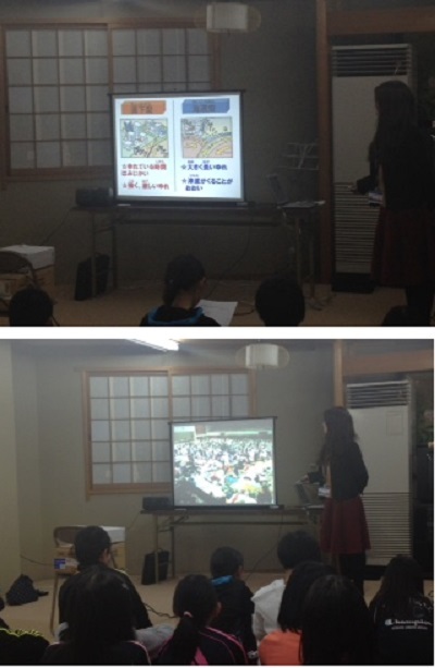 夕食後のたのしいひと時のあと、大阪市の危機管理室の方から写真や動画、絵図を見せていただき地震について学びます。