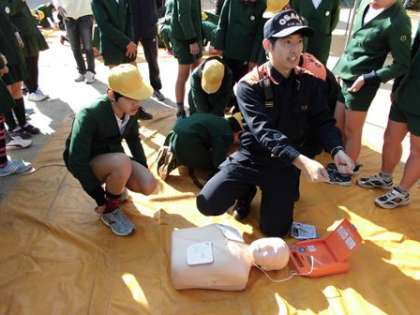 代表の児童がAEDを実際に触り、みんなで手順を習いました。
