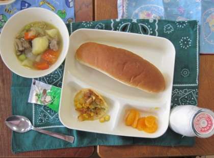 今日のスープ煮ににんじんが入っています。にんじんは赤い色をしていますが、体の調子を整える緑の食べ物です。にんじんに含まれるビタミンは、肌やのどをじょうぶにしたり、かぜを予防したり、目の健康を守ったりします。