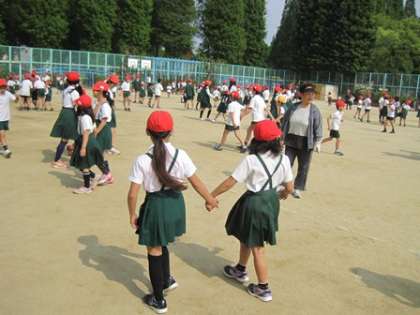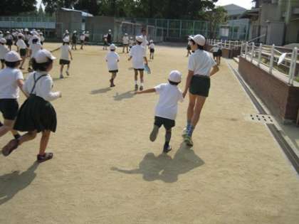 兄弟学年で手をつないで逃げて、二人のうち一人でもタッチされたら鬼になって タッチした人といっしょにつながっていくゲームです。