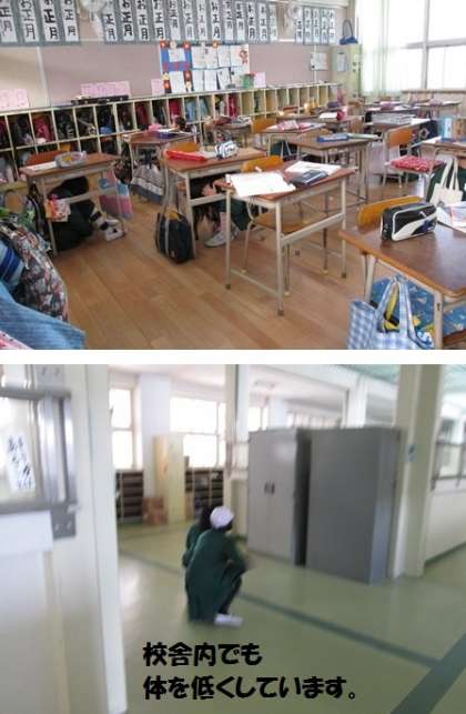 地震はいつ起こるかわかりません。そのときどうしたらいいかを考えながら避難する訓練です。「地震発生!!」という校内放送に合わせて、児童達は避難行動をとりました。