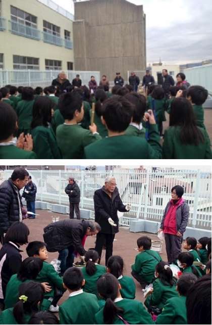 地域の老人会、婦人会の方に学校へ来ていただき、昔の道具体験を行いました。
