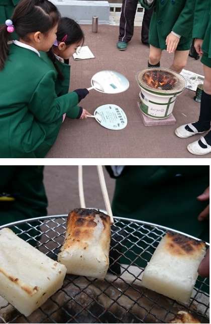 その後、3階のテラスに出て七輪を使って火をおこし、お餅を焼きました。