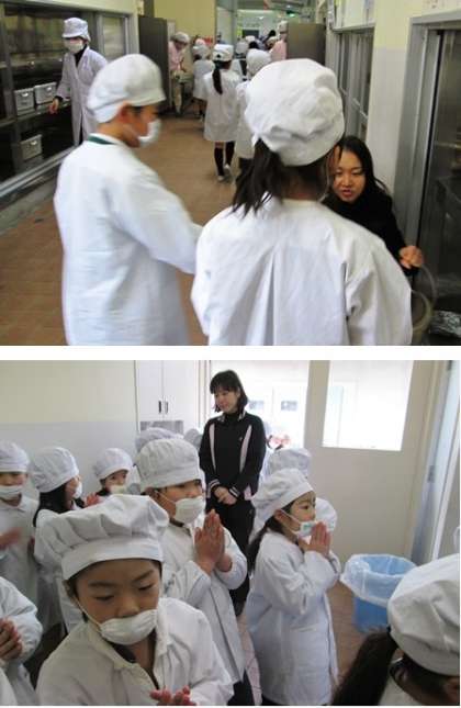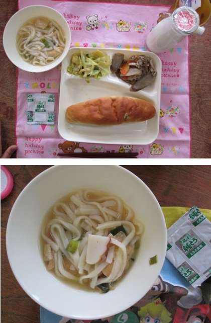 「なにわうどん」は、三角に切ってあまからく煮たうすあげと、かまぼこ、青ネギが入った「きつねうどん」をイメージしたうどんに、袋入りのとろろこんぶを入れて食べます。「きつねうどん」は大阪で生まれたといわれていること、とろろこんぶは大阪で昔から作られていることから、「なにわうどん」と名付けられました。