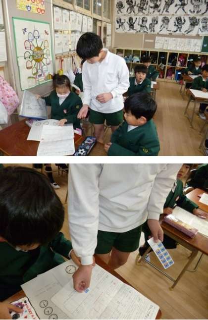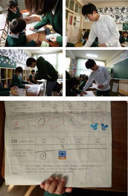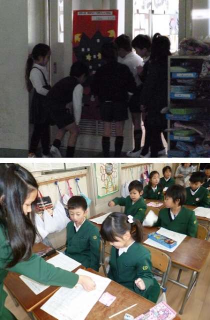 低学年の教室では、担任の先生にかわって保健員会の児童がハンカチ調べをしていました。ハンカチを持ってきていた児童には「がんばりりカード」にかわいいシールが貼られました。シールをもらった児童はとても嬉しそうでした。
