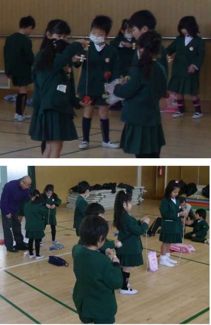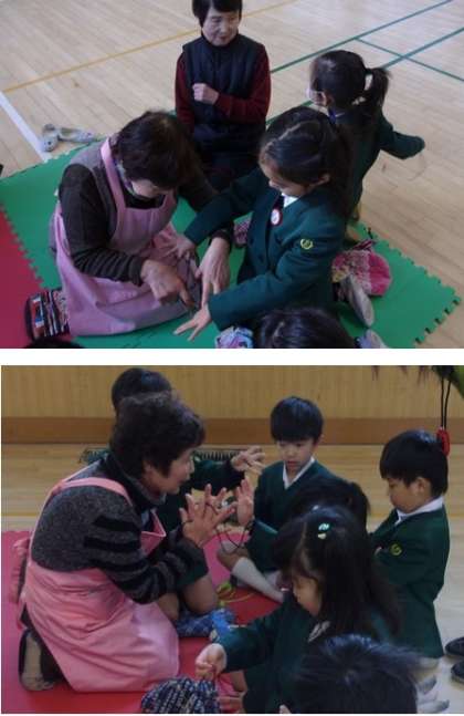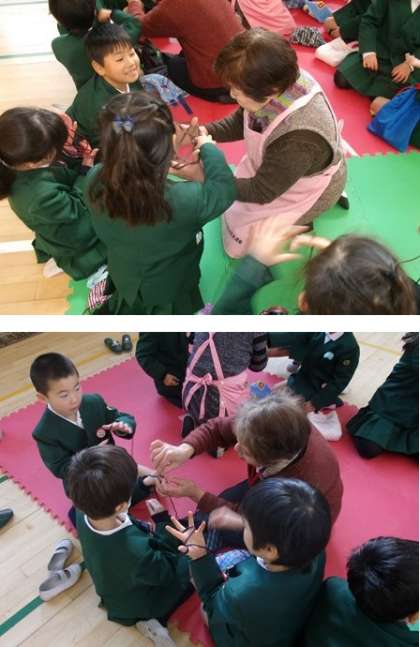 あやとりをしている糸は、お手玉と一緒に地域の方がプレゼントしてくださったものです。