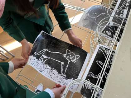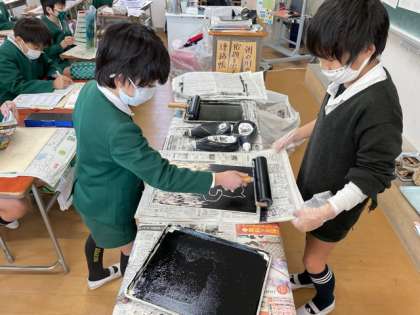 ローラーで墨を版木に塗り、和紙を載せて上からバレンでこすります。