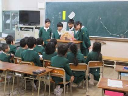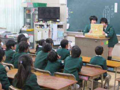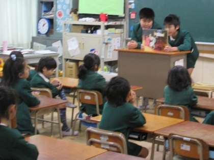 情報委員会の児童が、みどりタイム(朝の時間)を利用して、低学年の教室へ紙芝居の出前に行きました。
