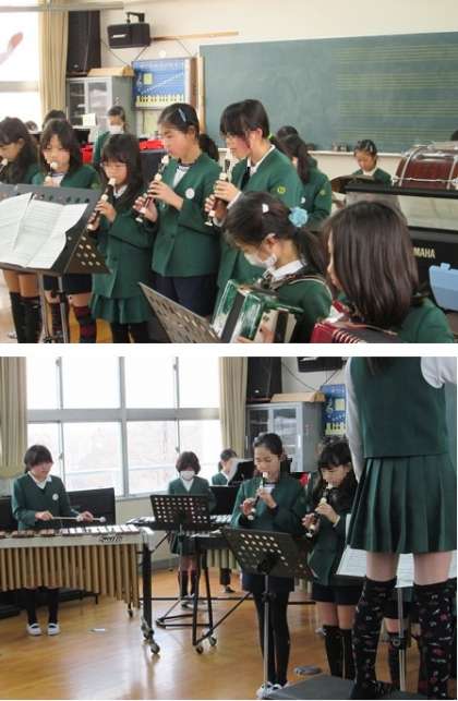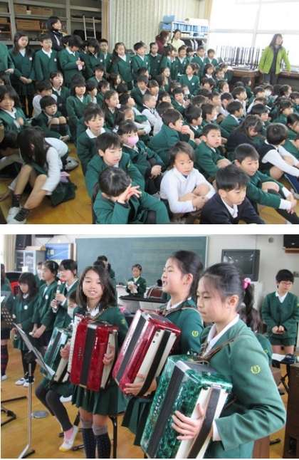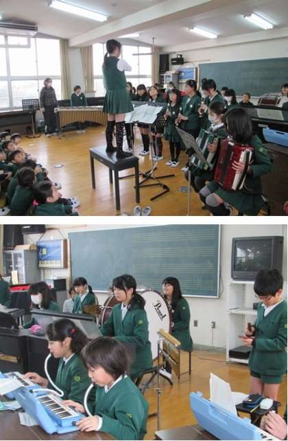 1、2年の児童が招待されて音楽室で演奏を聞かせてもらいました。