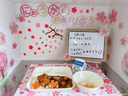 人気献立の「カツカレーライス」と、ミックスフルーツの彩りがきれいな「フルーツ白玉」で、1年生の入学と、2〜6年生の進級をお祝いしながら食べました。