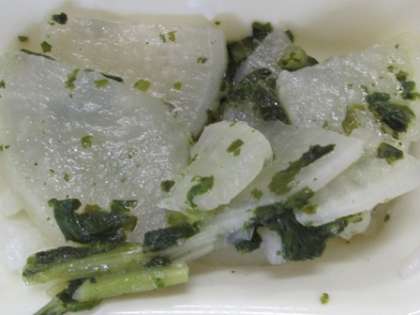 だいこんとだいこんの葉をそれぞれ別に塩ゆでします。砂糖、塩、こしょう、りんご酢、薄口しょうゆを合わせて煮、火を止めてからサラダ油を入れてドレッシングをつくります。最後にだいこん、だいこんの葉、ドレッシングをあわせて完成です。