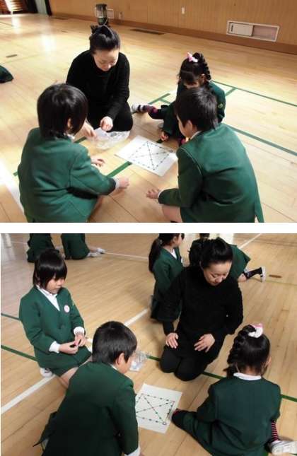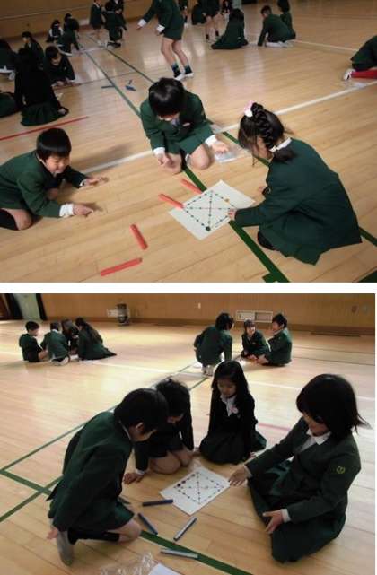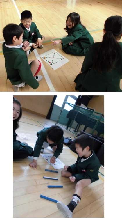子どもたちが遊んでいるのは「ユンノリ」という韓国・朝鮮のすごろく遊びです。サイコロの代わりに「ユッ」という棒を使います。投げた時の表、裏の数によってコマの進む数が決まります。