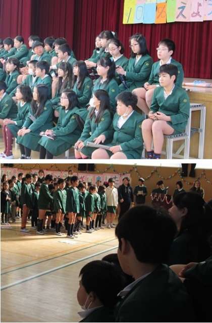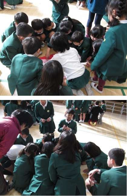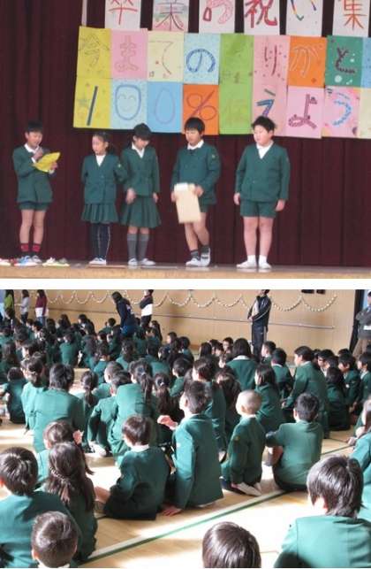 運営委員会の児童が舞台上で説明をした後、たてわり班ごとに文字のパズルを完成させました。それがみんなそろうと「6年生のみなさんいままでありがとうございました」という文章が完成しました。