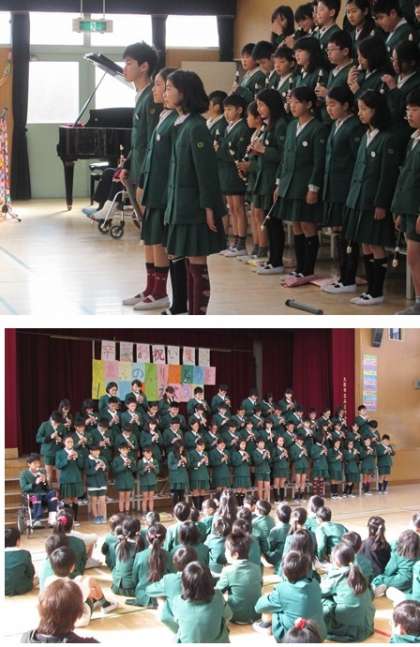 今度は6年生からのお礼の言葉、合奏、歌がありました。とっても気持ちのこもった歌で在校生も一生懸命聞いていました。