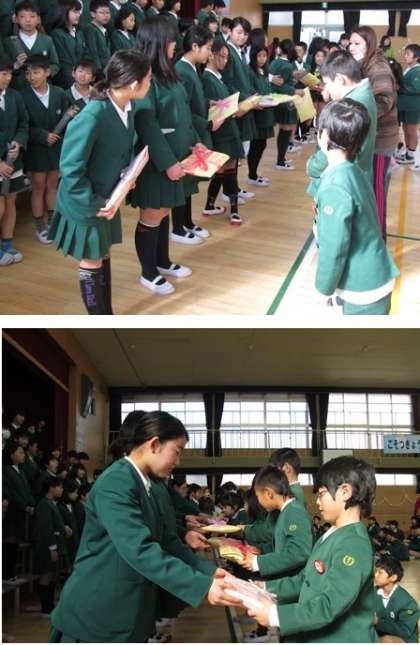歌のあと、6年生から在校生に向けての「ぞうきん」のプレゼントがありました。4月になって新しい学年になったら開いてくださいね。在校生の皆さんにむけたメッセージカードが入っています。