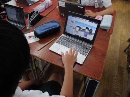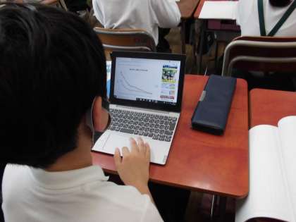 オンラインの授業以外にも、パソコンを使っての学習が進んでいます。6年生は社会科の歴史教材をパワーポイントでプレゼン形式にまとめています。5年生は環境問題の調べ学習に使っていました。