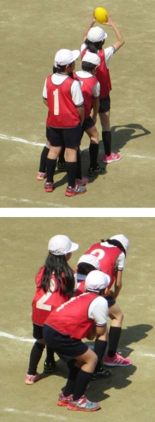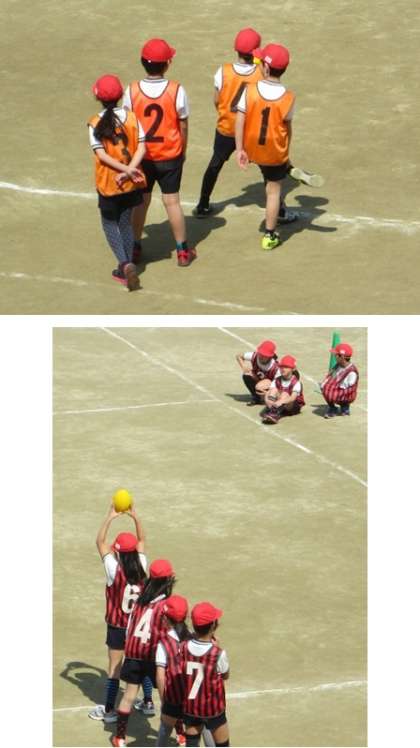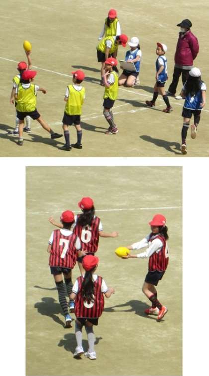 アメリカンフットボールの変形で、グループで作戦を立てて攻撃をし、ゴールラインまでボールを運べたら3点になります。