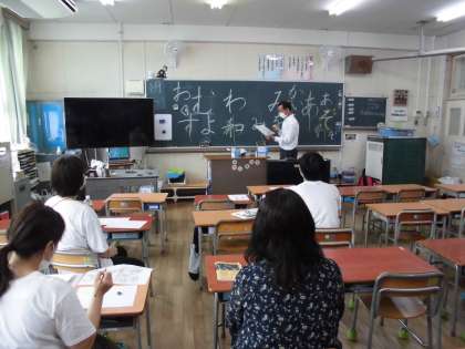 1年生に「えんぴつのもち方」の指導を終えたのち、教職員を対象に「板書の文字の書き方」「ひらがな指導のポイント」など実践的な研修会をしていただきました。明日からすぐに役立つ充実した研修会でした。
