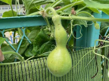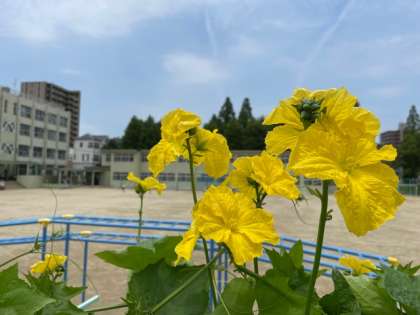 下はヘチマです。小さいヘチマがたくさんなっています。さて、ヘチマの花の色は、何色でしょう?答えは、プールの横に確かめに行ってね。