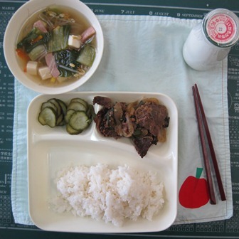 「ナムル」というのは、大豆もやしやきゅうりなどの「あえもの」のことで、ごま油・醤油やごま、にんにく、唐辛子などで調味します。給食では、辛くないように塩ゆでしたきゅうりを、砂糖・酢・醤油であえています。