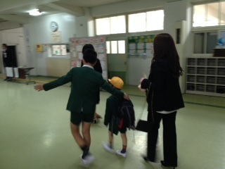 教室前の受付で1年生に名札をつけてあげ、くつ箱を教えてくれます。そして、教室の座席に座らせてくれます。