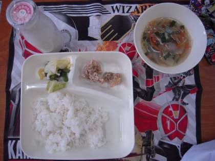 今日のこんだて:鶏肉のからあげ、ワンタンの皮のスープ、キャベツと三度豆の甘酢あえ、ごはん、牛乳