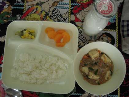 今日のこんだて:マーボーどうふ、チンゲンサイとコーンの中華あえ、みかん(缶づめ)、ごはん、牛乳