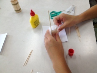 最初に説明を聞いて、つまようじをフィルムケースのまわりに木工ボンドを使って貼り付けてて作りました。