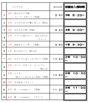 プログラム(予定)と保護者入場時間を掲載しておきます。