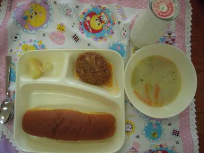 今日のこんだて:煮こみハンバーグ、豆乳コーンスープ、焼きじゃが、パン、牛乳